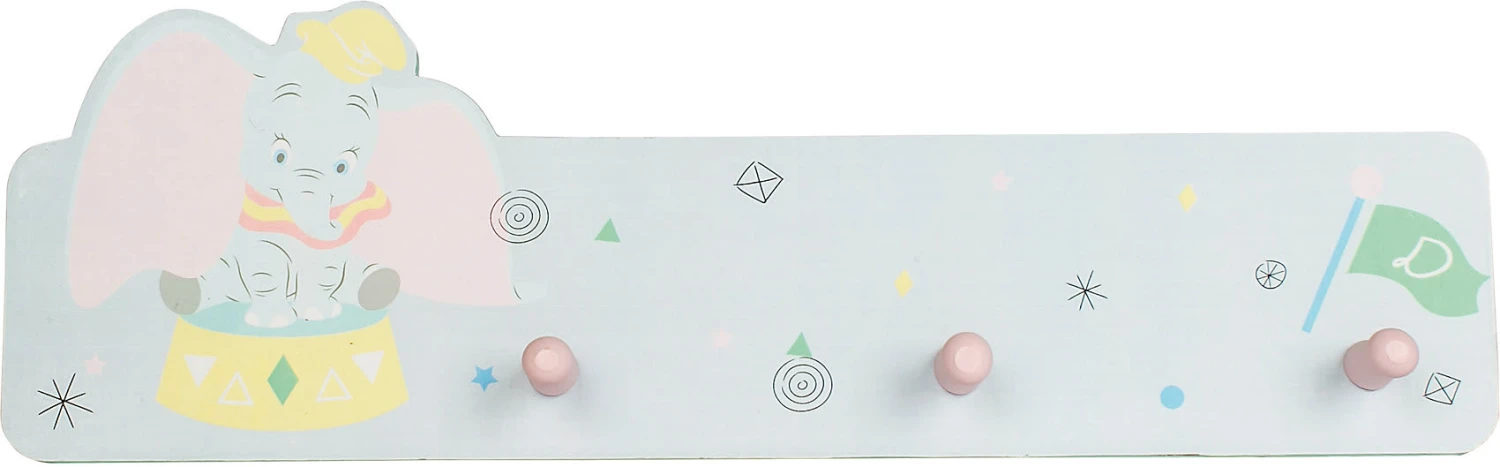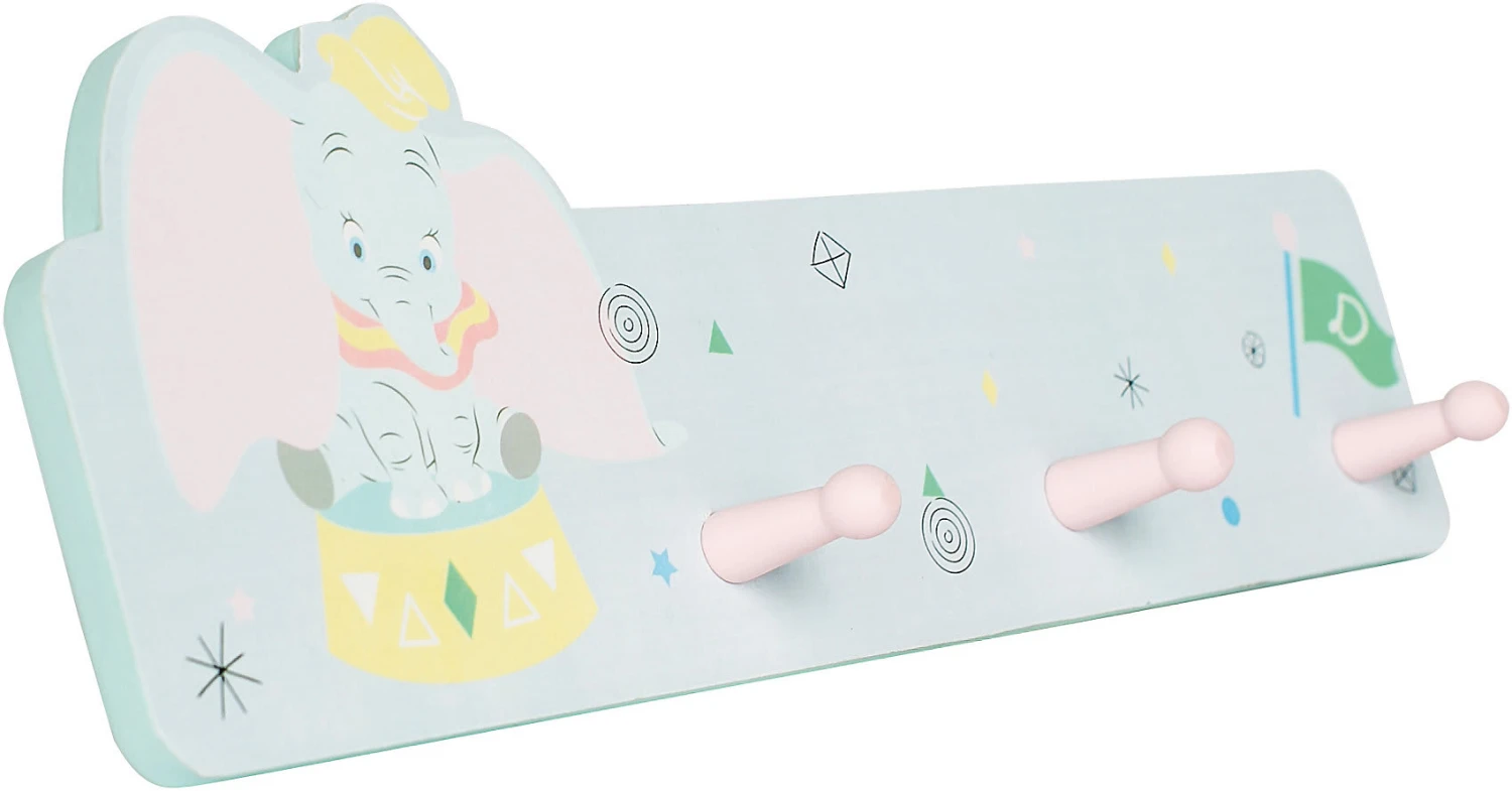 Auf drei Haken können kleine Abenteurer nach einem langen Tag Jacke, Schal und Co sicher unterbringen. Das niedliche „Dumbo“-Motiv sorgt für ein kindgerechtes Erscheinungsbild und viel Freude bei allen Fans des großohrigen Elefanten. Das helle Design in dezenten Farbtönen fügt sich wunderbar in jedes Kinderzimmer und jeden Eingangsbereich.