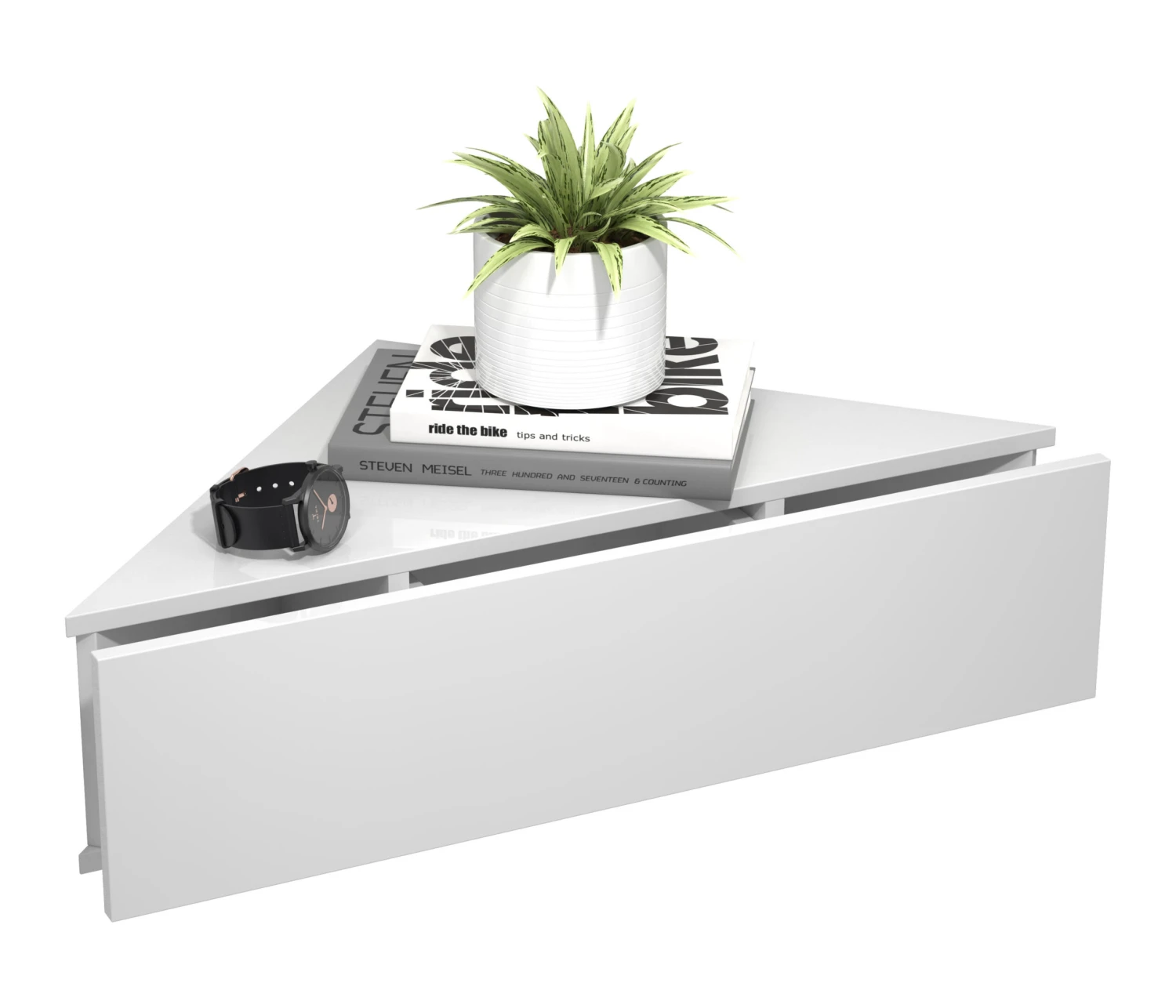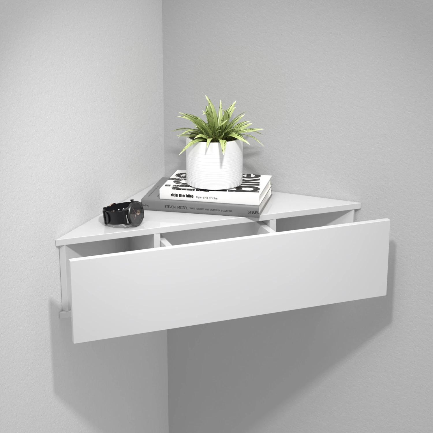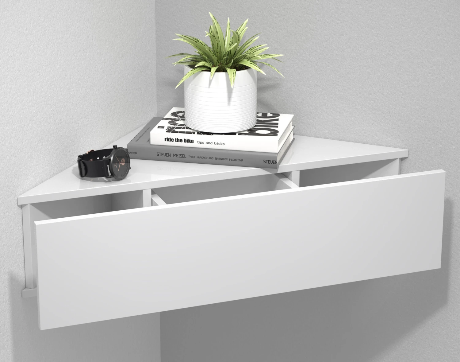– Hängendes Eckregal mit leichtgängiger Schublade