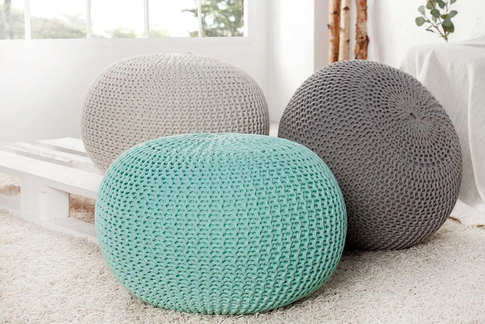 Mit Strick – ob gekauft oder selbstgemacht – liegen Sie voll im Trend. Als Sitzgelegenheit oder Fußbank, unsere Design Poufs LEEDS aus Strick finden in jedem Zuhause ihren Platz. Jeder Pouf wurde in Handarbeit gefertigt – jede gestrickte Fußbank ein Unikat. Stilvoll, modern und funktionell präsentieren sie sich stets von ihrer besten Seite. Egal welches Alter, aufgrund ihrer großen Variation an Farben und ihres modernen Stils kann diese Sitzgelegenheit wirklich jeden überzeugen. Rund und gemütlich sind Poufs die Hingucker Ihrer Wohnung. Setzen Sie sich drauf oder legen Sie Ihre Füße hoch und genießen Sie einen Moment der Ruhe. Unsere Poufs bestehen aus Baumwolle und sind sehr strapazierfähig und Formbeständig. Gefüllt mit kleinen Styroporkugeln, welche für eine hohe Sitzqualität sorgen.