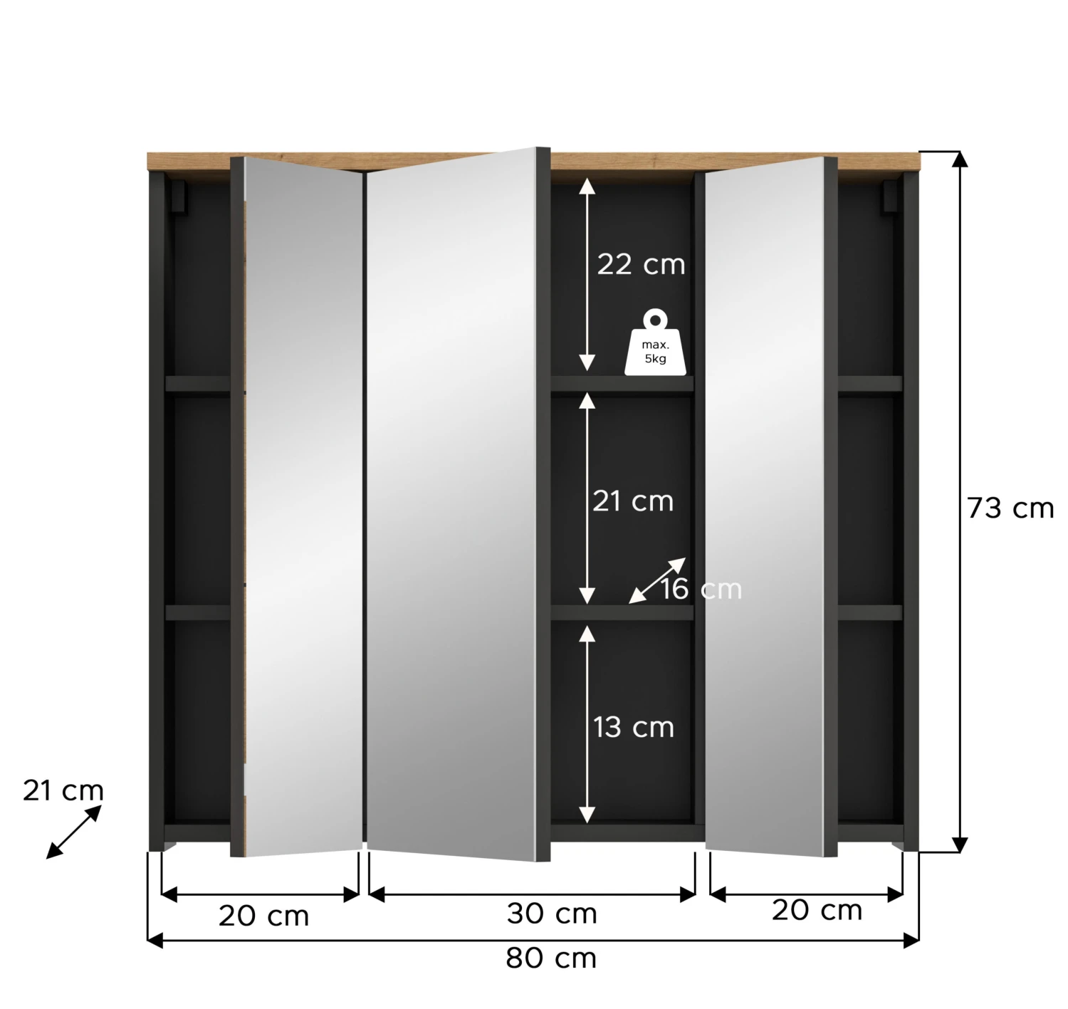 Der Spiegelschrank (B/H/T: 80x73x21 cm) kombiniert ein modernes Design mit praktischen Funktionen. Die Basalt Grau Nachbildung und die Artisan Nachbildung in Holzoptik werden durch einen eleganten schwarzen Innenraum und eine obere Holzleiste harmonisch ergänzt. Dieses Design schafft eine stilvolle und zeitgemäße Optik. Mit drei großen Spiegeltüren bietet der Schrank eine klare Reflexion und zusätzlichen Komfort im Badezimmer. Hinter den Türen verbirgt sich ein großzügiger Stauraum, der für Ordnung und Übersichtlichkeit sorgt. Diese Kombination aus Spiegelflächen und verdecktem Stauraum macht den Spiegelschrank zur idealen Lösung für ein aufgeräumtes Badezimmer. Der Schrank besteht aus FSC®-zertifiziertem Holzwerkstoff, was ihn zu einer nachhaltigen Wahl macht und einen Beitrag zum Schutz der Wälder leistet. Dieser hochwertige Spiegelschrank verbindet Funktionalität, Ästhetik und Umweltbewusstsein – perfekt für moderne Badezimmer!