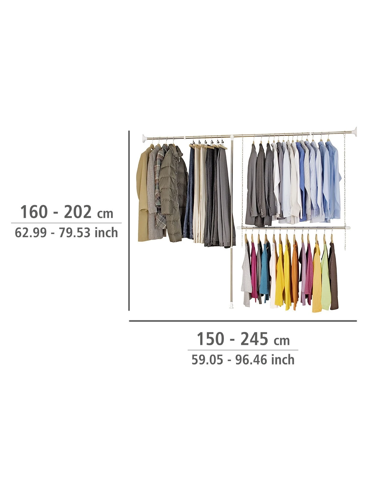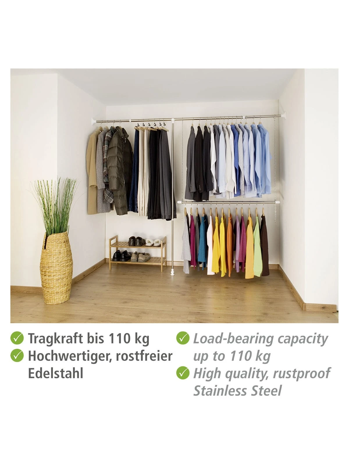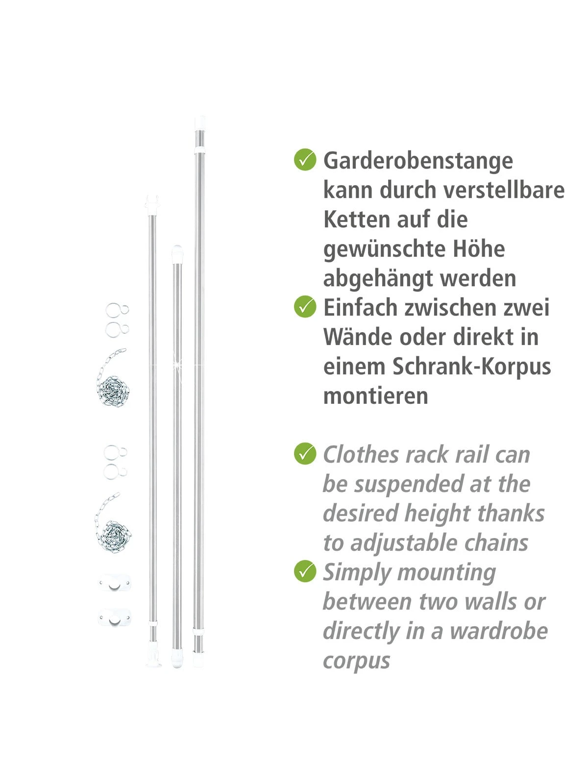 Das Garderoben-Set bietet viel Platz für Kleider, Mäntel, Oberteile, Hosen, Blusen oder Hemden. Es ist in der Breite teleskopisch von 150-245 cm ausziehbar und wird zwischen zwei Wände oder direkt in einem Schrank-Korpus montiert.