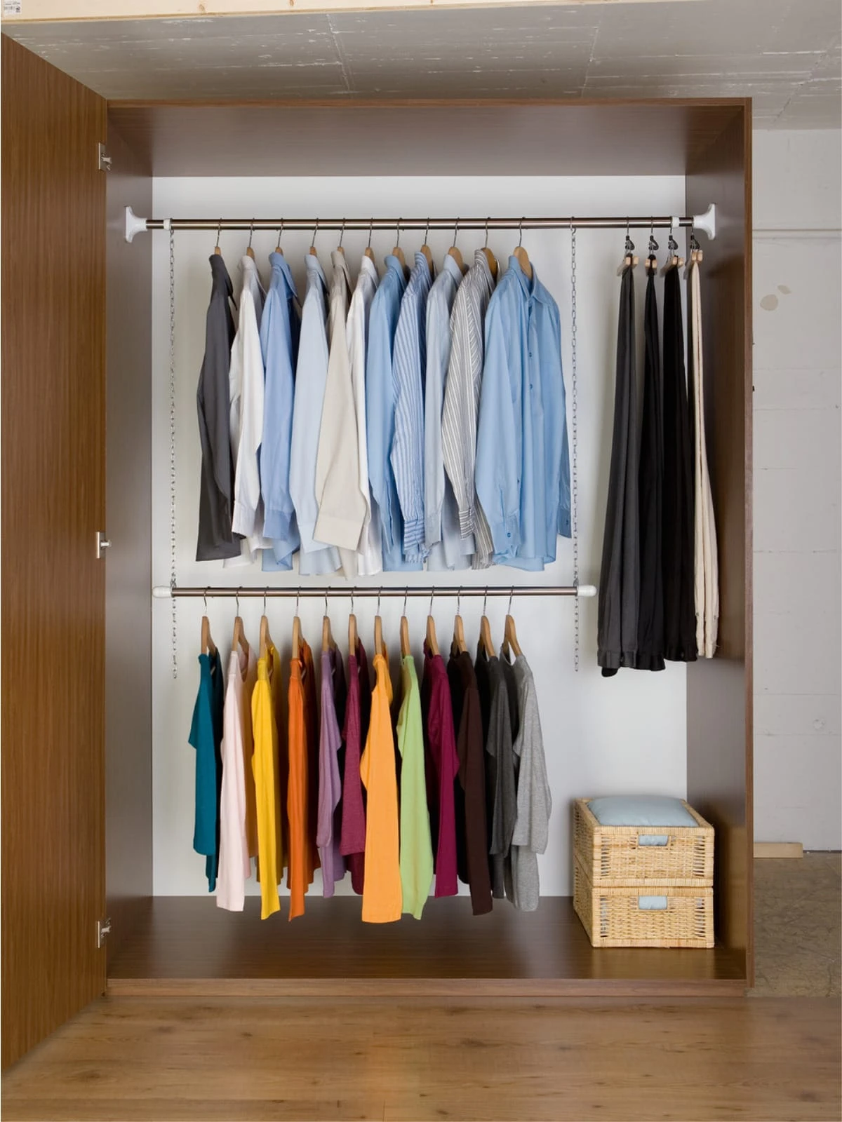 Eine weitere 122 cm breite Garderobenstange kann durch verstellbare Ketten auf die gewünschte Höhe abgehängt werden und schafft zusätzlichen Platz.
